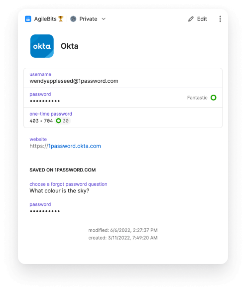 1Password は、アプリやウェブサイトへのサインイン時に、ユーザー名とパスワードを記録できます。自動フォームフィラー機能により、シングルクリック、顔認証、またはワンタッチですべてのオンラインアカウントにサインインすることができます。