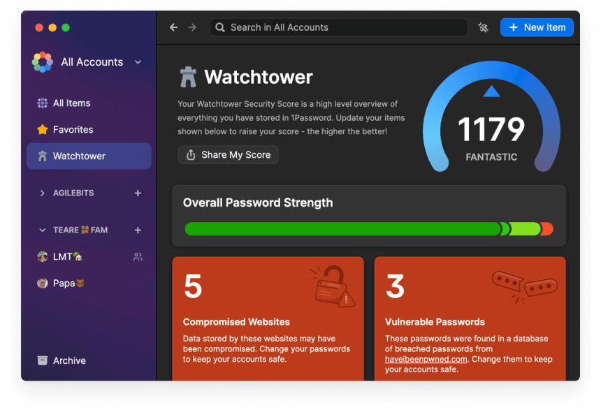 Watchtower は、パスワードの漏洩やその他のセキュリティー問題を常に追跡し、アカウントを安全な状態に保ちます。 脆弱なパスワード、漏洩したパスワード、および重複したパスワード等がないかをチェックし、また二段階認証が設定されていないサイトや、安全でないhttpを使用しているサイトがある場合は通知します。